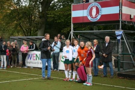 Torhüterin Tamina Stölken (UHC), Verteidigerin Marisa Martin Pelegrina (Mülheim), im Mittelfeld Nina Steikowsky (UHC) und Stürmerin Carolin Hoffmann (Mülheim)